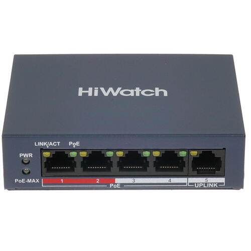 Коммутатор HiWatch DS-S504P(B), кол-во портов: 4x100 Мбит/с, кол-во SFP/uplink: RJ-45 1x100 Мбит/с, PoE: 4x30Вт (макс. 35Вт) (DS-S504P(B)), DS-S504P(B)