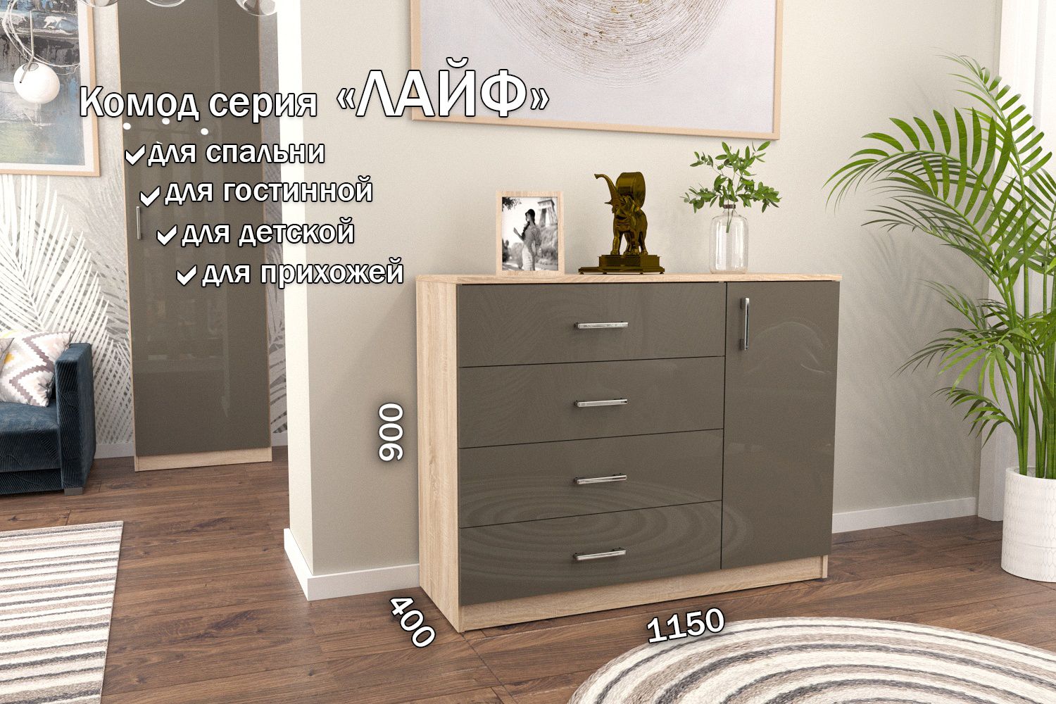 Комод Лайф 115*40*90 (ящики+дверь) ЛКМ-03 Дуб сонома/Латте, Лайф 115*40*90 (ящики+дверь)