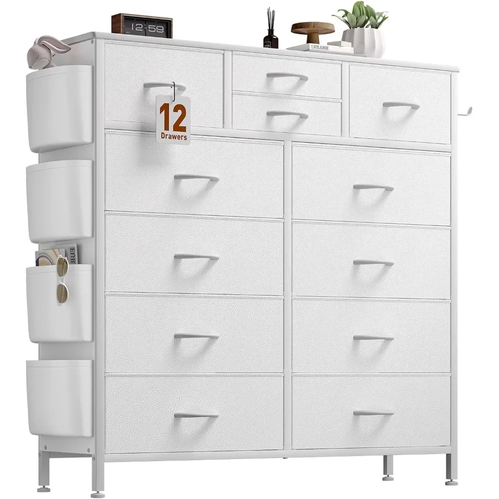 Dresser for Bedroom with 12 Drawers, Chest of Drawers with Side Pockets and Hooks, PU Fabric Dresser Drawers for Living Room