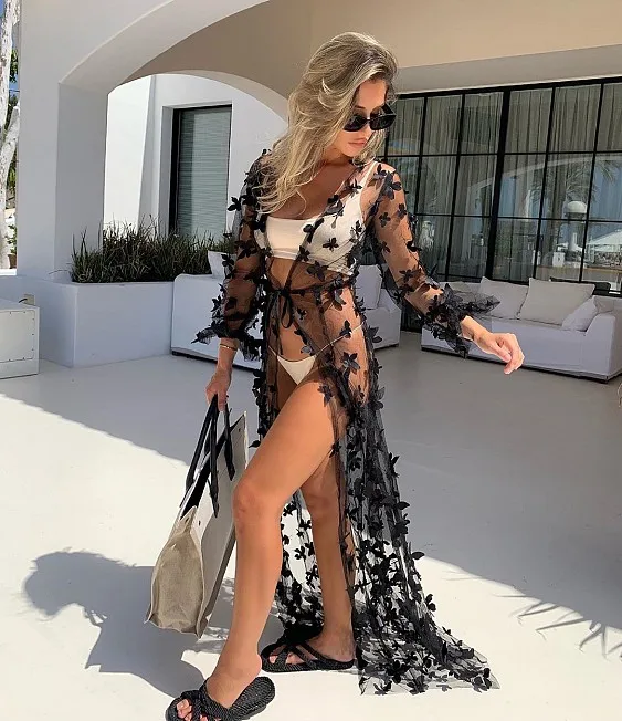 Пикантное летнее женское кружевное кимоно с 3D бабочками, вязаный крючком купальник, кардиган, бикини, накидка, пляжная одежда, длинные накидки