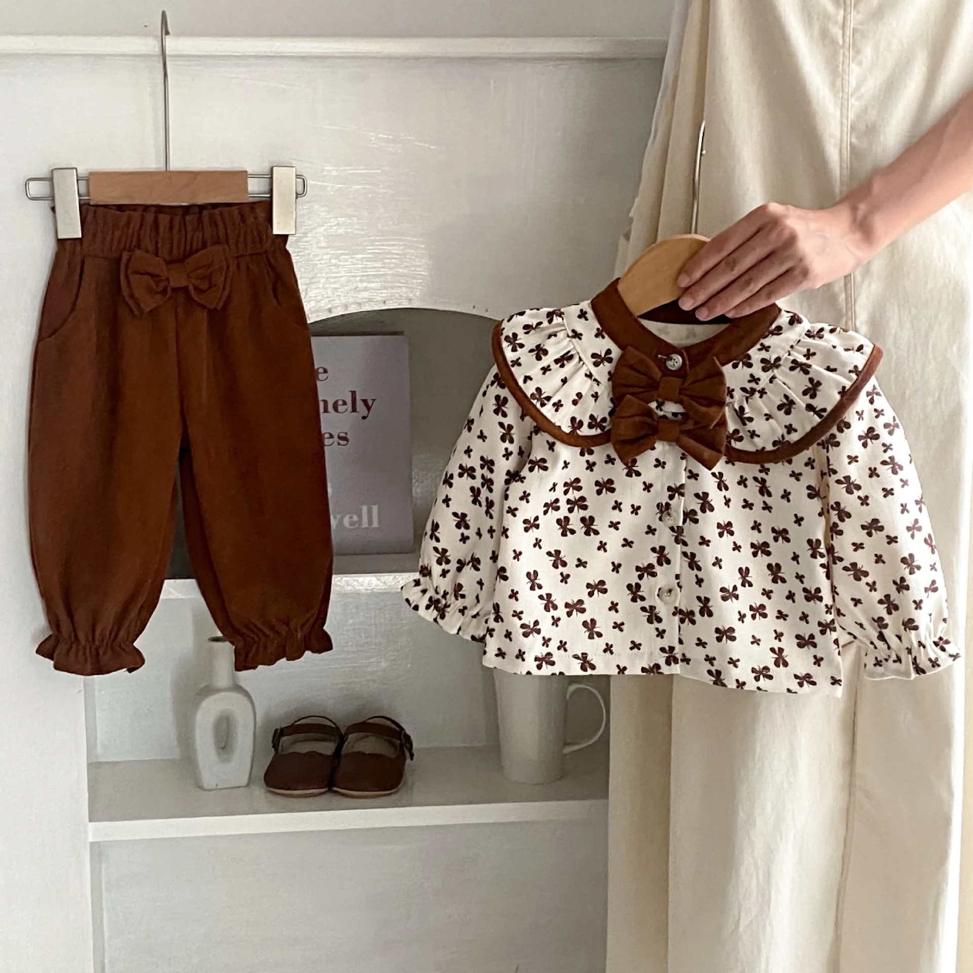 Комплекты детской одежды, Новинка осени 2023, костюм для маленьких девочек, топ с принтом четырехлистного клевера и бантом + штаны, комплект из двух предметов для маленьких девочек