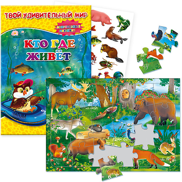 Книжка рассказывает интересные явления о лесных животных и о том, где они живут, предлагает задания и содержит многоразовые тематические наклейки. Наклейки разделены на блоки и рассказывают постепенно о разных группах зверей, всего в наборе 43 наклейки. Пазл в специальной рамке с нижним картонным слоем можно собирать и в дороге, ведь его детали не разбегутся по сторонам.