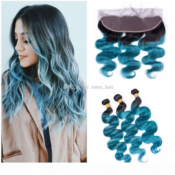 two tone blue human hair bundles with lace frontal closure brazilian virgin human hair body wave ombre lace frontal with bundles, Black;brown
