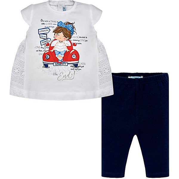 Футболка с коротким рукавом свободного кроя. Легко надевается благодаря кнопкам на спинке. По бокам украшена ажурными вставками. Спереди декорирована принтом в виде девочки, которая сидит на машинке. Имеются надписи. Однотонные леггинсы на мягкой резинке. Комплект обеспечивает хорошую воздухопроницаемость. Комфортная посадка не сковывает движений.