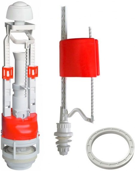 для бачка унитаза, пластик, нижний подвод воды, однорежимный, белый/красный