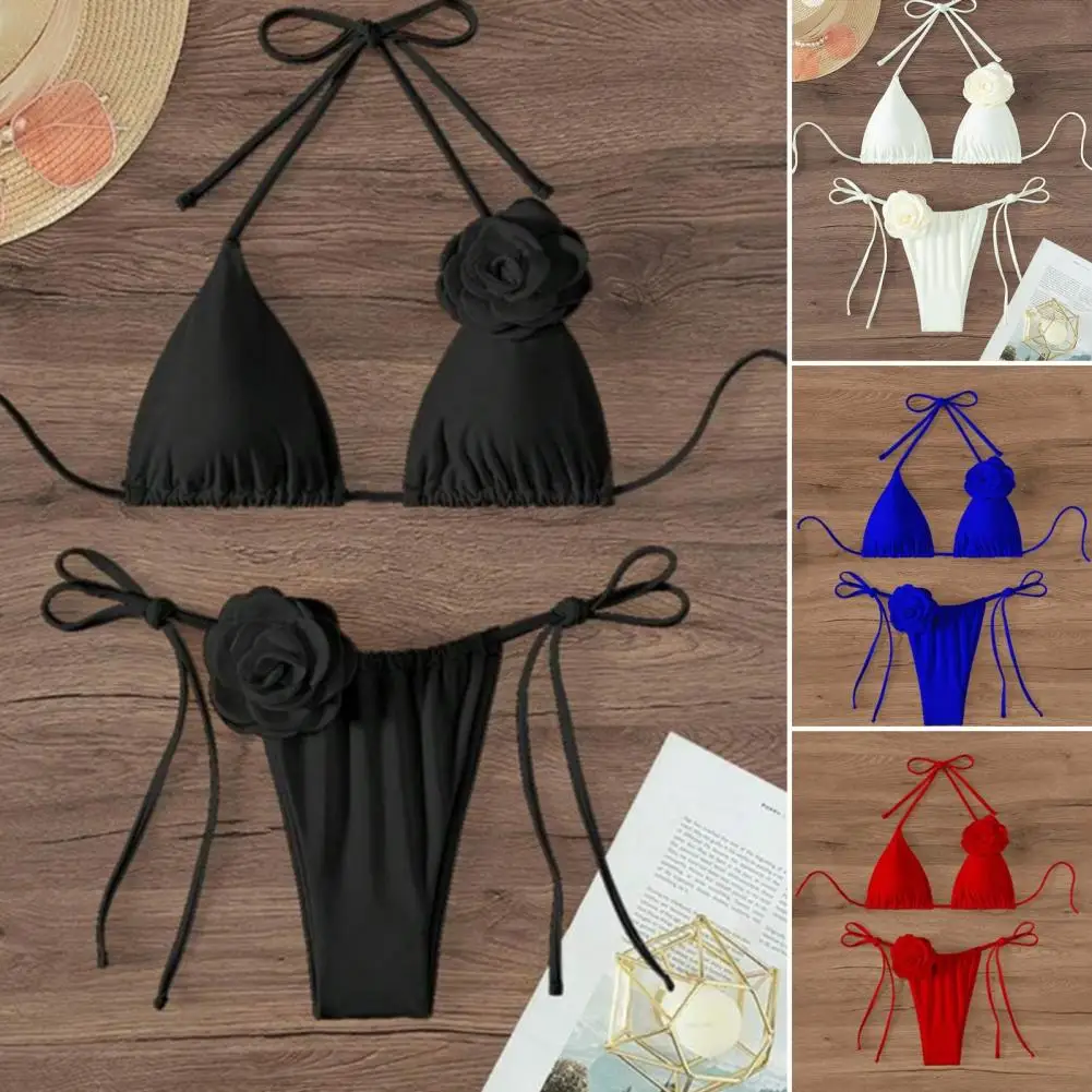 Комплект бикини женский однотонный на шнуровке, купальный костюм с лямкой на шее, с декоративными вставками из искусственных цветов, пляжная одежда в стиле пэчворк, 2 шт./комплект
