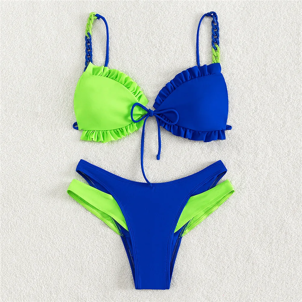 Комплект бикини женский с пуш-ап, пикантный плиссированный купальник с оборками и завышенной талией, купальный костюм с металлическими цепочками и лямками, 2024