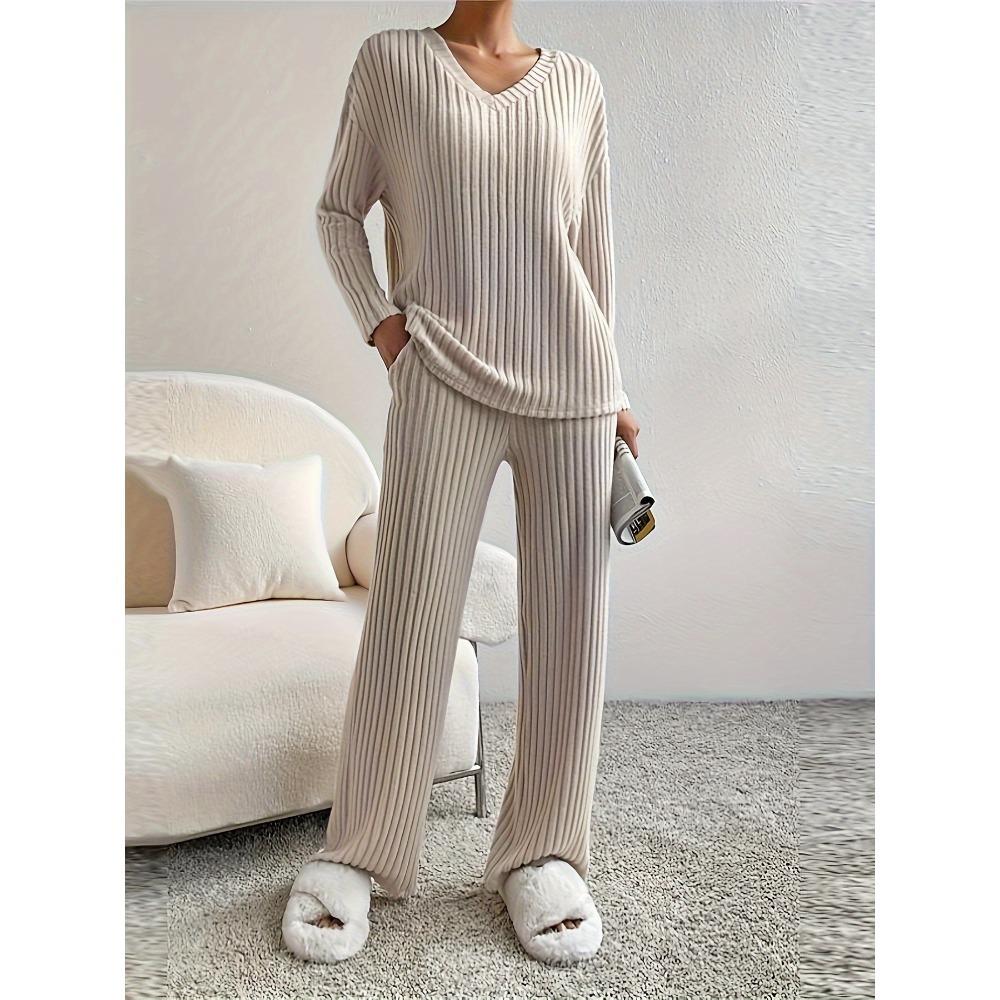 Комплект брюк из яркого полиэстера с V-образным вырезом, длинными рукавами, карманами, прямыми штанинами, элегантный S бежевый