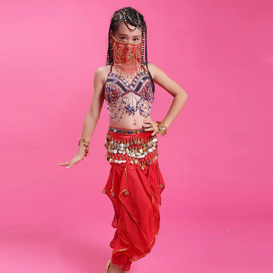 Комплект для девочек из 3 предметов для танца живота (топ + штаны + пояс) Детские высококачественные профессиональные Костюмы для индийских/е...