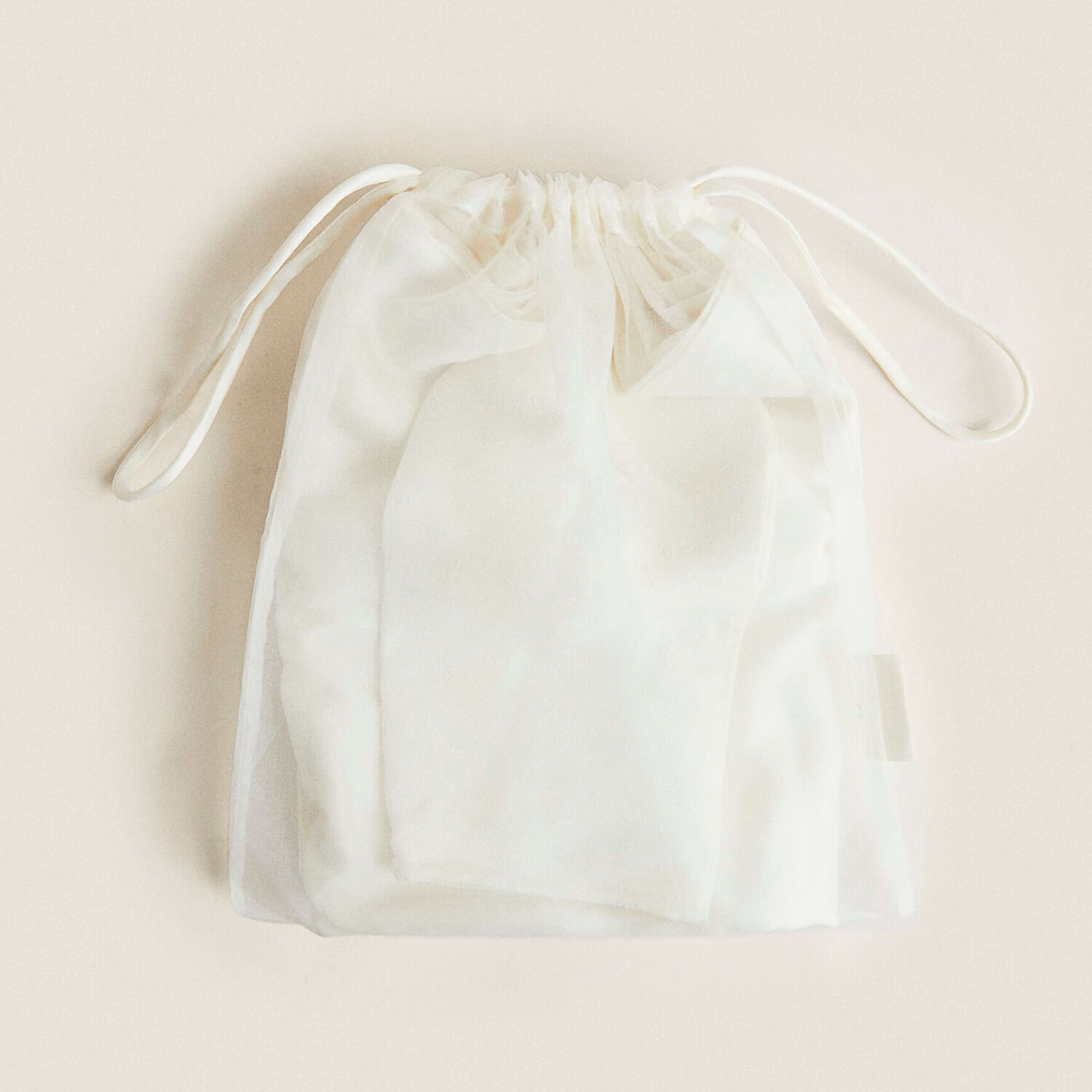 Комплект из перчатки и полотенца из 100% шелка тутового дерева. Перчатку и полотенце можно использовать с обеих сторон. Одна сторона используется для отшелушивания, а другая — для полировки и смягчения кожи. Комплект упакован в мешочек с завязками.