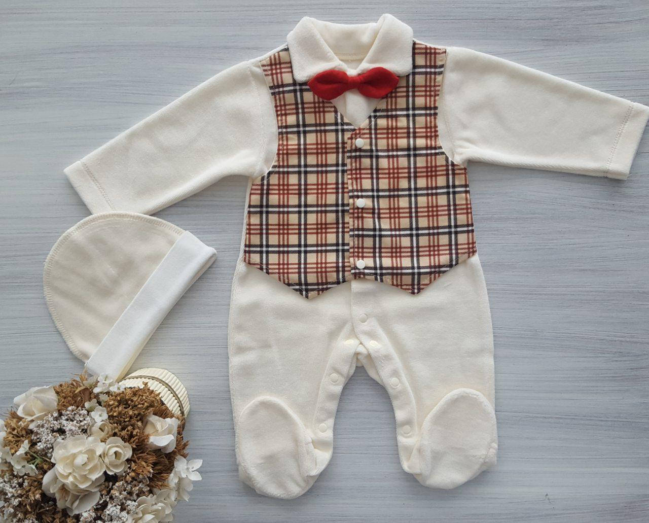 Человечек из велюра на новорожденного мальчика очень нарядный с чепчиком без завязок. Спереди есть бабочка и жилетка-обманка в клеточку на подкладке. Размеры 56, 62 и 68. Цвет молочный. Жилетка в 2х цветах.