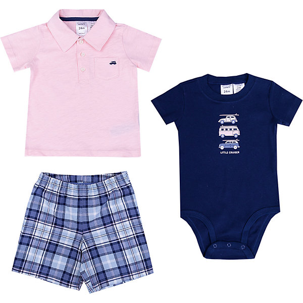 Классическая футболка поло и боди с короткими рукавами. Клетчаты шорты на резинке. Комплект украшен различными узорами на изделиях. Модели из натуральной ткани обладают дышащими свойствами.