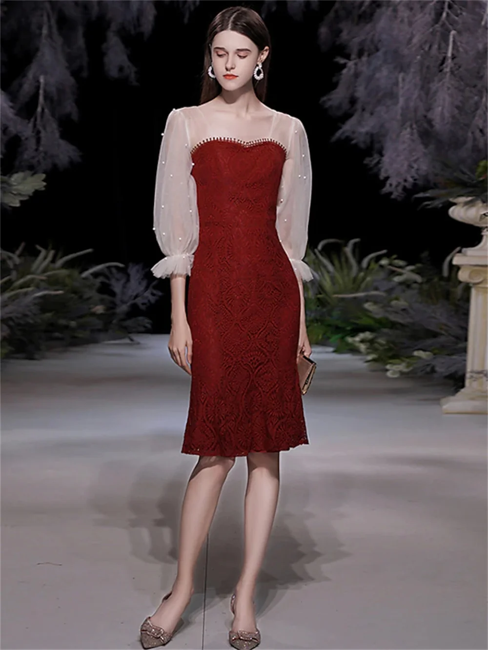 Romantic White Tulle Evening Dress Red Lace Sweetheart Prom Dress Long Sleeve Puffy Beaded Formal Party Dress Romantic White Tul