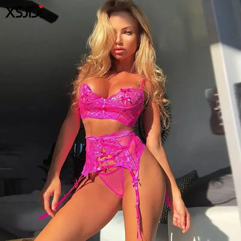 Комплект женского кружевного нижнего белья с цветочным принтом и чашками пуш-ап