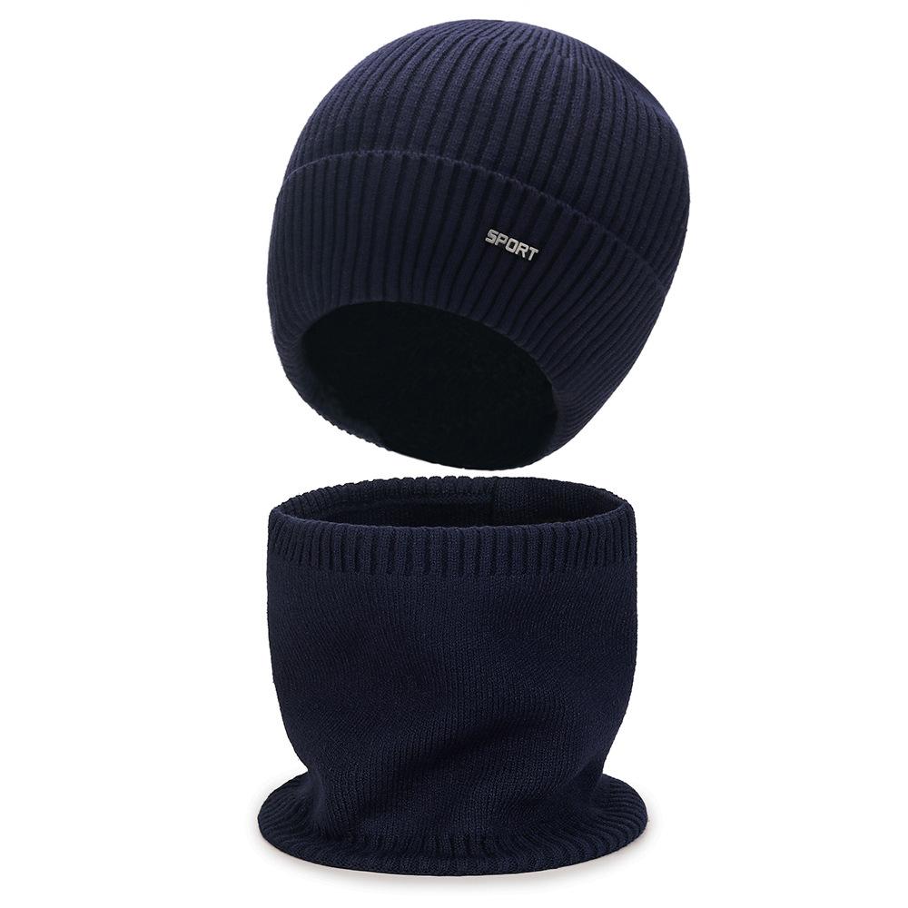 Комплект из двух частей, мужская зимняя вязаная шапка, лыжная толстая теплая шерстяная шапка для верховой езды, защищающая уши, шапка с шарфом темно-синий