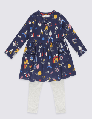Комплект из чистого хлопка для девочки 3 мес - 5 лет: платье с рисунком и карманами и однотонные леггинсы