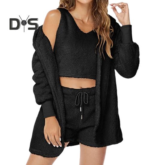 Комплект из 3 предметов: осенне-зимнее женское пальто, жилет, шорты, комплект из плотной плюшевой домашней одежды, одежда для сна, с капюшоном, длинными рукавами, открытая строчка, теплая куртка на шнурке L чёрный