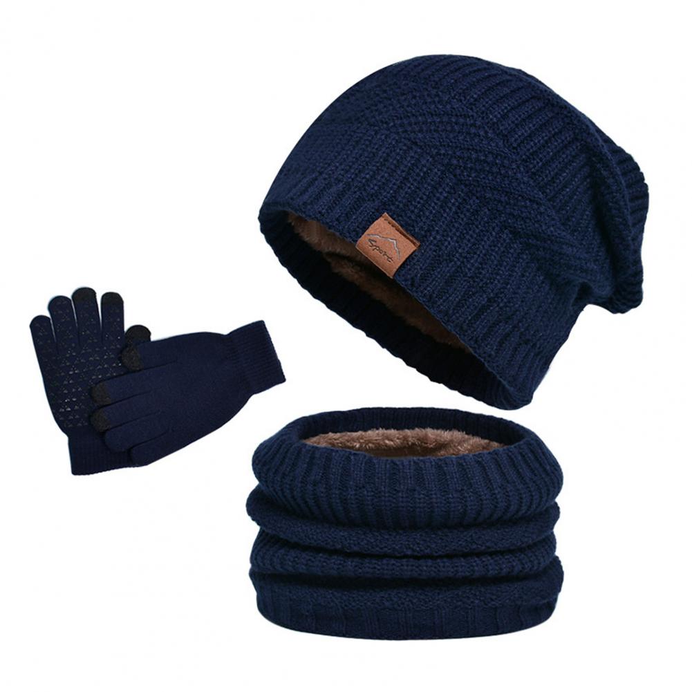Комплект из 3 предметов: шапка, шарф и перчатки, толстые плюшевые, вязаные, теплые, эластичные, с ушками, на пять пальцев, ветрозащитные, для зимнего отдыха на открытом воздухе, для велоспорта темно-синий