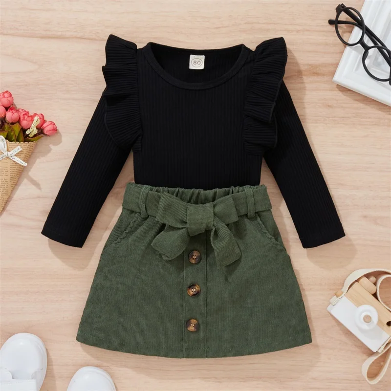 Комплект одежды для маленьких девочек из 2 предметов, свитер в рубчик с оборками на рукавах + декоративная Вельветовая юбка-карандаш на пуго...