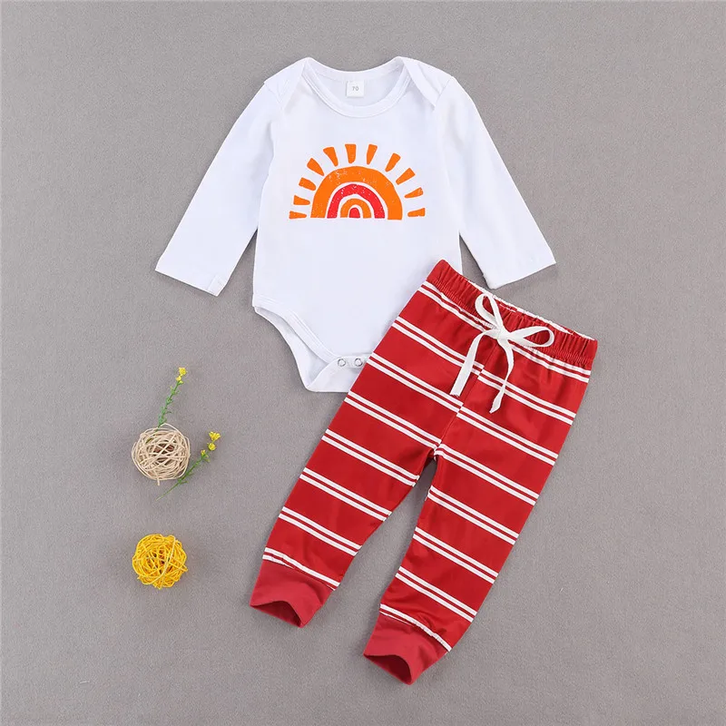 Комплект одежды для новорожденных мальчиков и девочек 0-12 месяцев, боди с длинными рукавами и рисунком радуги, костюм с топом и штанами в пол...
