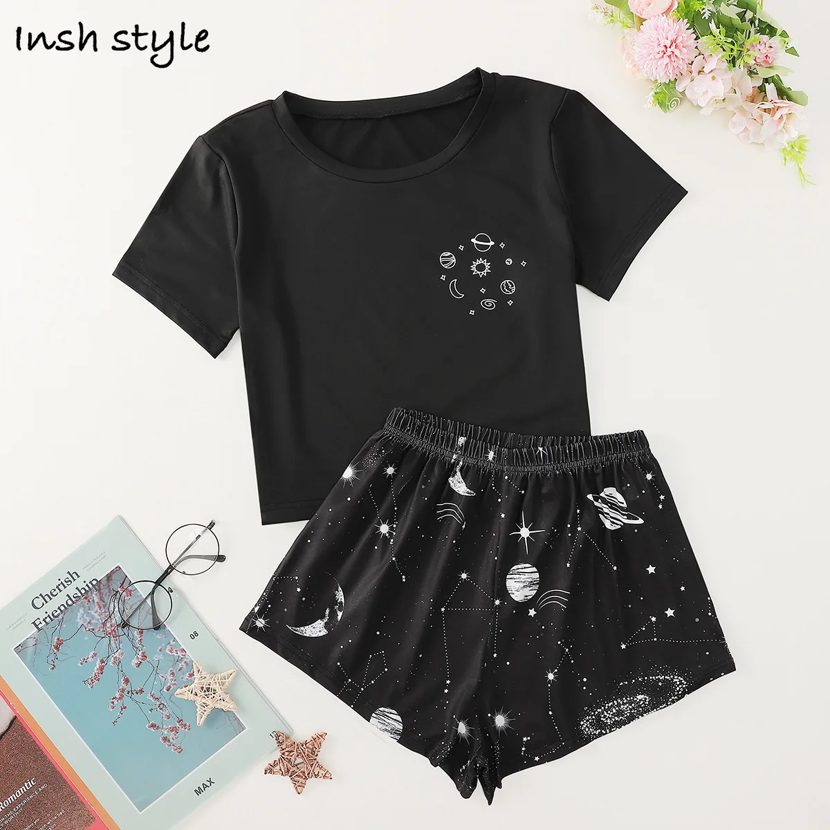 Комплект пижамный женский из полиэстера, с круглым вырезом и шортами