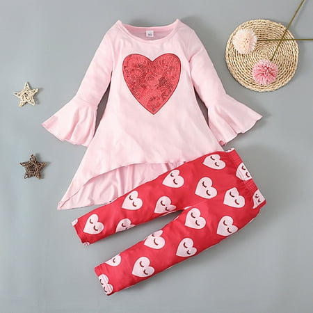QIPOPIQ Infant Girl s Clothing Set Clearance Valentine s Day Children s Girl s Clothing Trumpet Sleeve Top Pants Love Pattern Two-piece Set