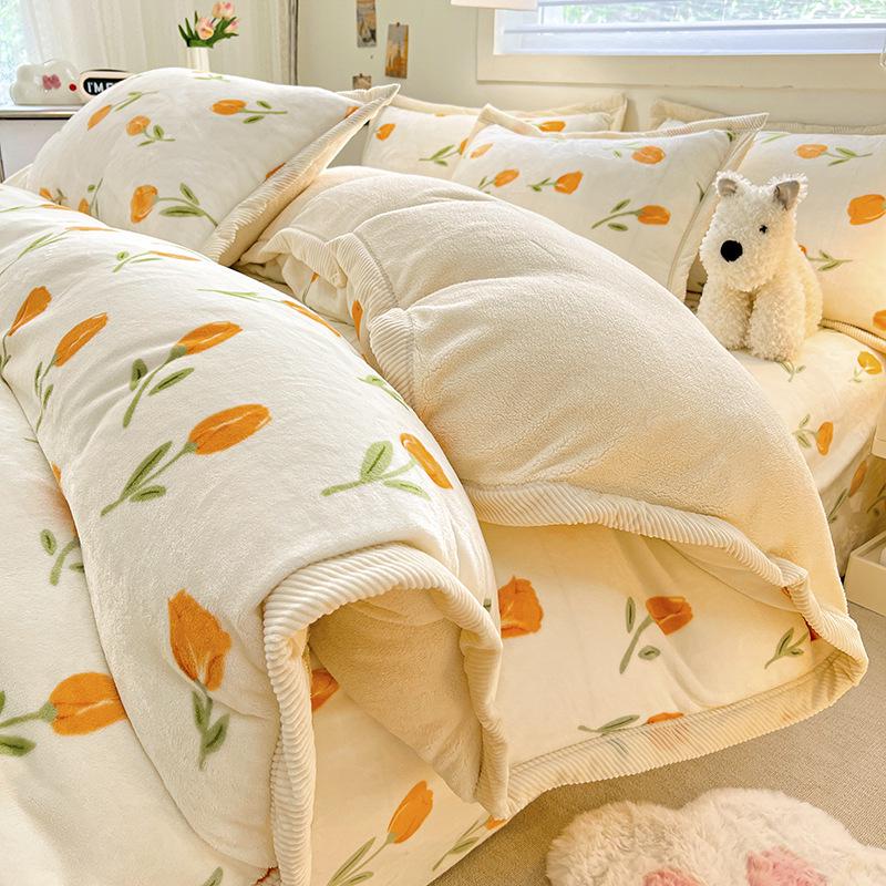Комплект постельного белья из кораллового флиса, вдохновленный кашемиром: Теплый, Вышитый и Утолщенный - Доступно три или четыре предмета
