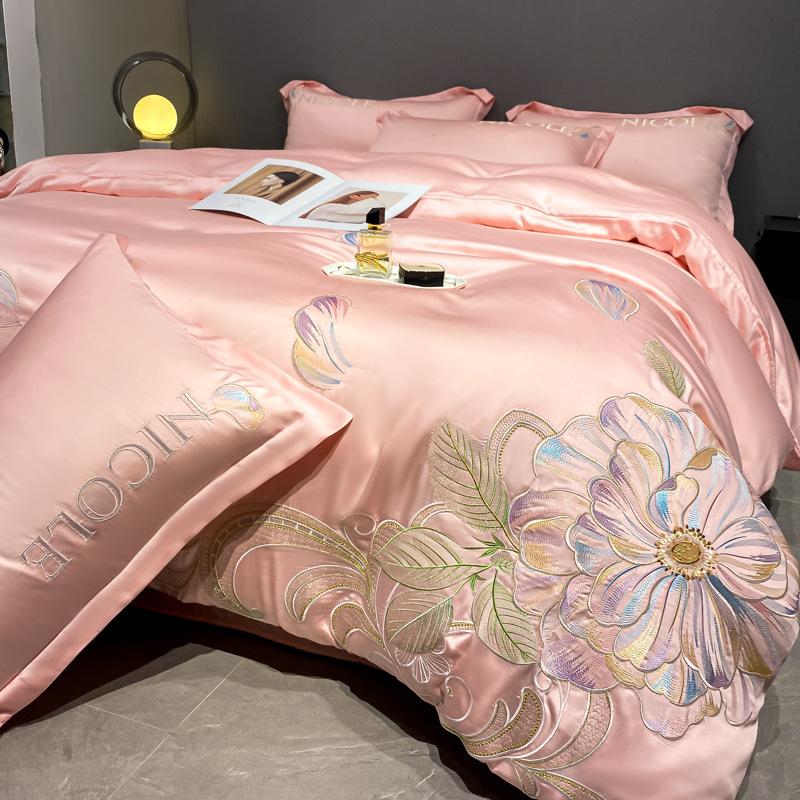 Комплект постельного белья из ледяного шелка, четырехпредметный, вышивка, приятный к коже, дышащий, удобный, простыня, пододеяльник, наволочка 2.0m bed