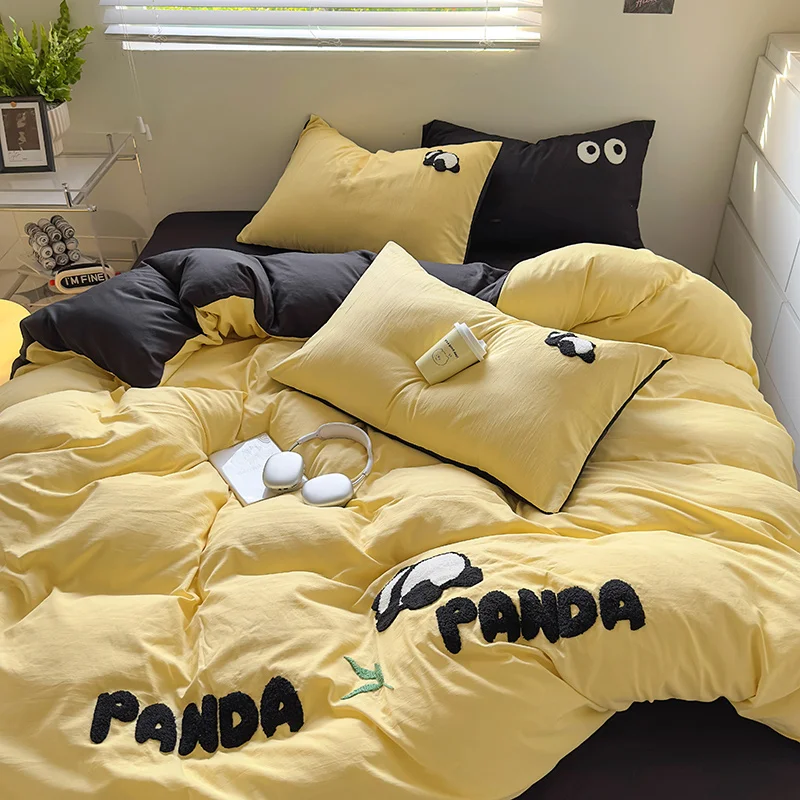 Комплект постельного белья из мытого хлопка для детей, Комплект постельного белья с вышивкой в виде панды, для двуспальной кровати