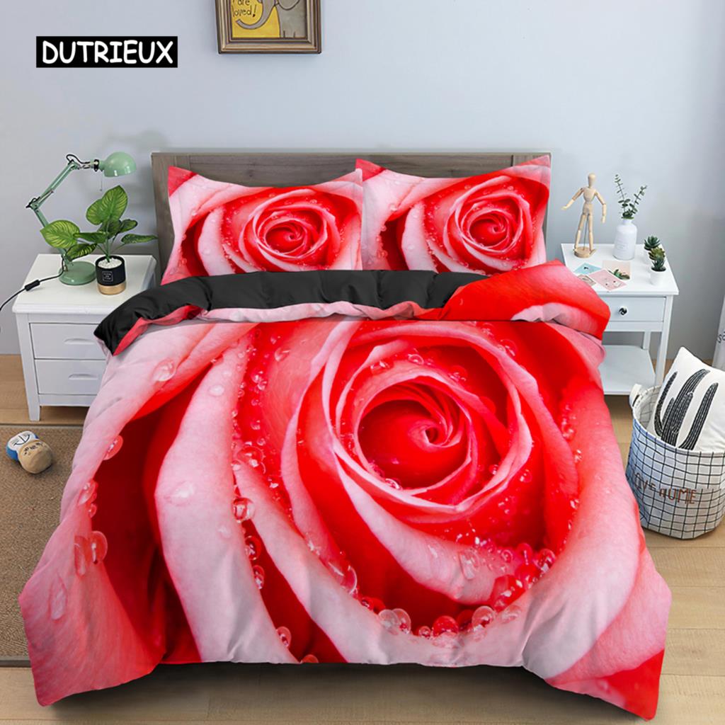 Комплект постельного белья ко Дню святого Валентина, 2/3 шт., роскошный пододеяльник с розовым принтом и сердечками, микрофибра King с 3D-принтом красной розы US Full(200x230cm)