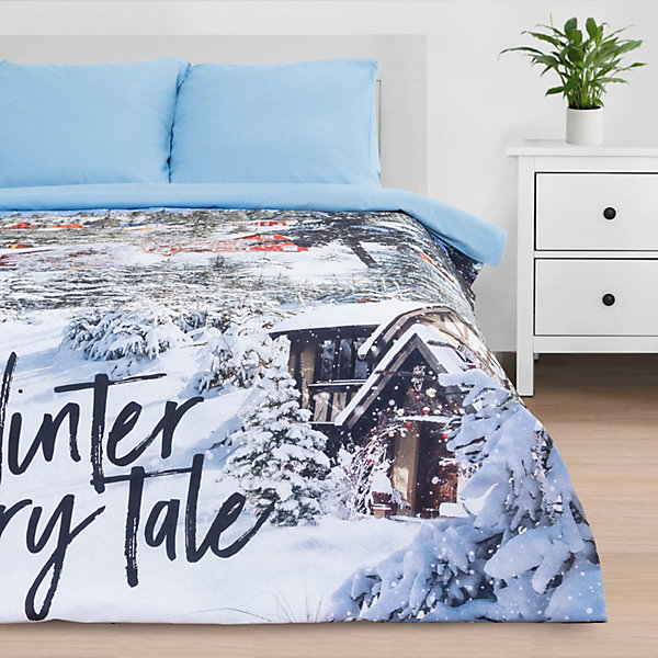 Комплект выполнен в новогодней стилистике. Подойдет для полуторной кровати. Качественный материал легко поддается глажке. Рисунок нанесен безопасными красителями. Комплект легко надевать на одеяло и подушку.