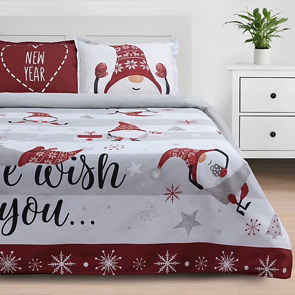 Комплект выполнен в новогодней стилистике. Подойдет для полуторной кровати. Качественный материал легко поддается глажке. Рисунок нанесен безопасными красителями. Комплект легко надевать на одеяло и подушку.