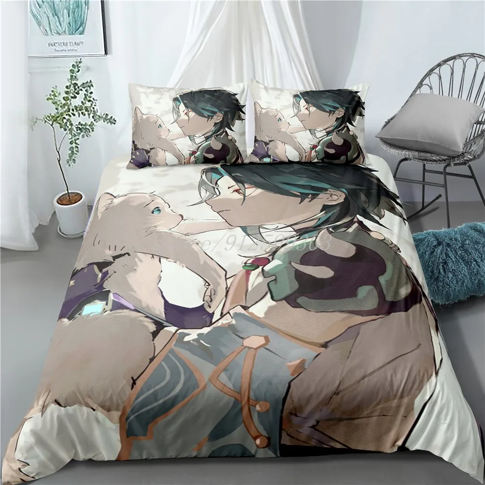 Комплект постельного белья Genshin Impact, Комплект постельного белья из мягкого пододеяльника и льна с 3d принтом, домашний текстиль, размеры Queen, ...