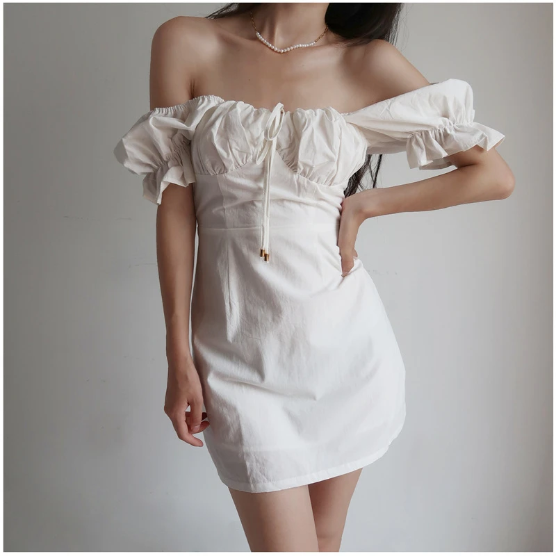 Summer New European and American Retro One-shoulder Dress Women's Solid Color Fresh Square Neck Puff Sleeve Short Skirt Women