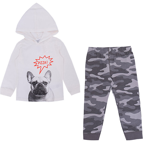Толстовка дополнена свободным капюшоном и декорирована принтом. Рукава не перекручиваются. Брюки прямого кроя, с рисунком хаки. Манжеты по низу фиксируют штанины. Изделия выполнены из натурального и дышащего материала.