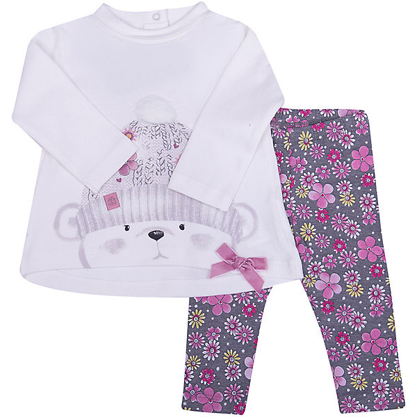 Красивый и удобный комплект выполнен из качественной и приятной ткани. Футболка с длинным рукавом застёгивается на три кнопки на спинке для удобства надевания. Спереди декорирована принтом в виде медвежонка в шапочке, а сбоку бантик контрастного цвета. Леггинсы декорированы цветочным принтом по всей поверхности, а мягкая резинка не давит на живот.