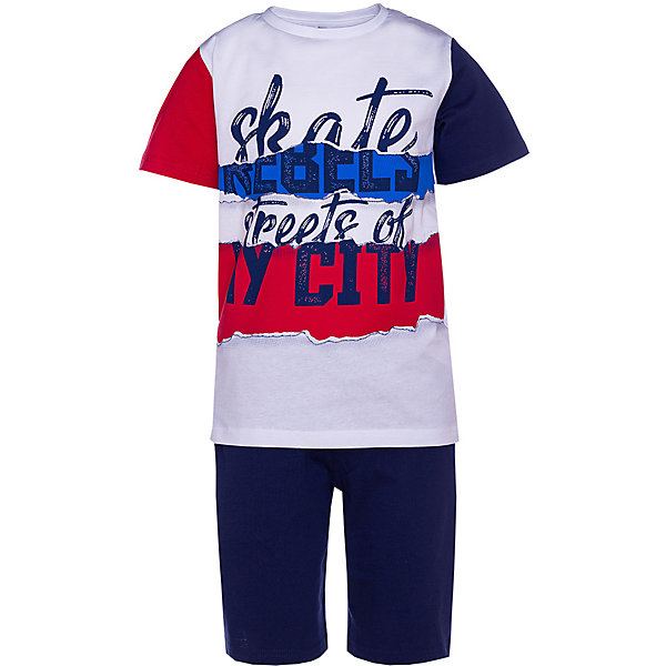 Футболка прямого кроя, короткие разноцветные рукава, круглая горловина. Декорирована принтом. Шорты свободного кроя. Удобно облегают в талии. Комплект обеспечивает комфортную посадку. Материал дышащий.