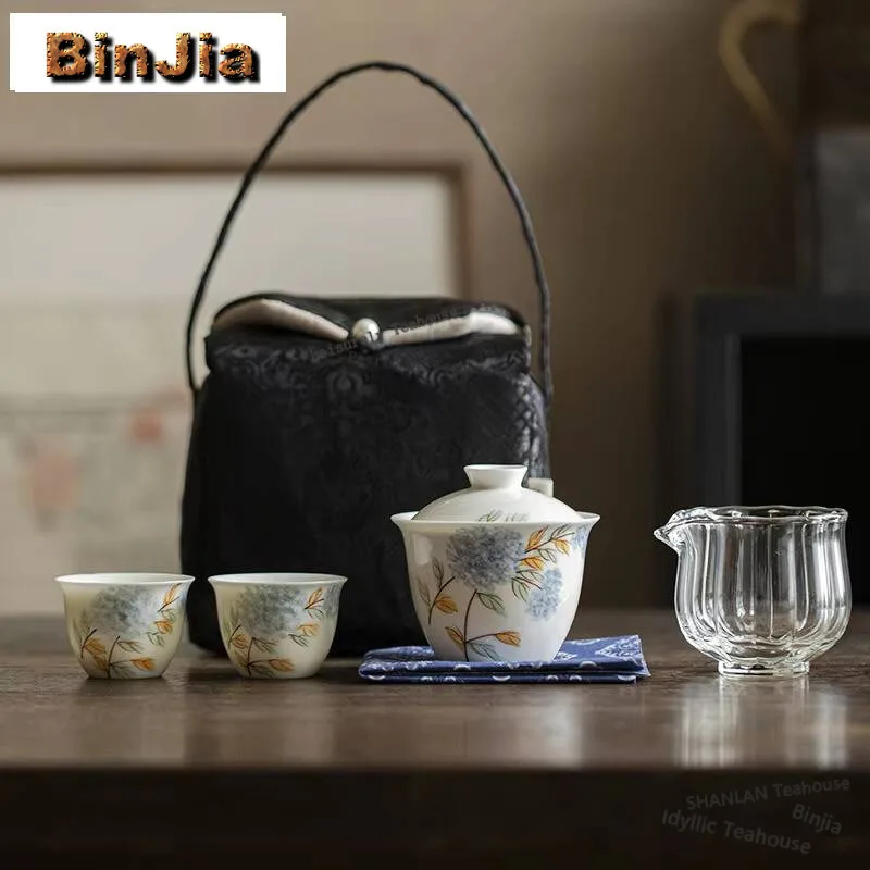 Комплект чашек из магазина с ручной росписью и крышкой для гортензии, комплект переносных сумок для хранения на открытом воздухе в стиле ретро, 1 чаша, 2 чашки, чайная утварь, подарочные пакеты, ремесла