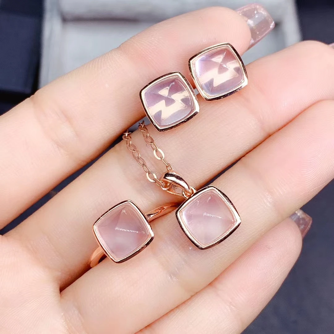 Комплект ювелирных украшений MeiBaPJ из натурального розового кварца, ожерелье и серьги из серебра 925 пробы и кольцо, свадебные украшения для ж...