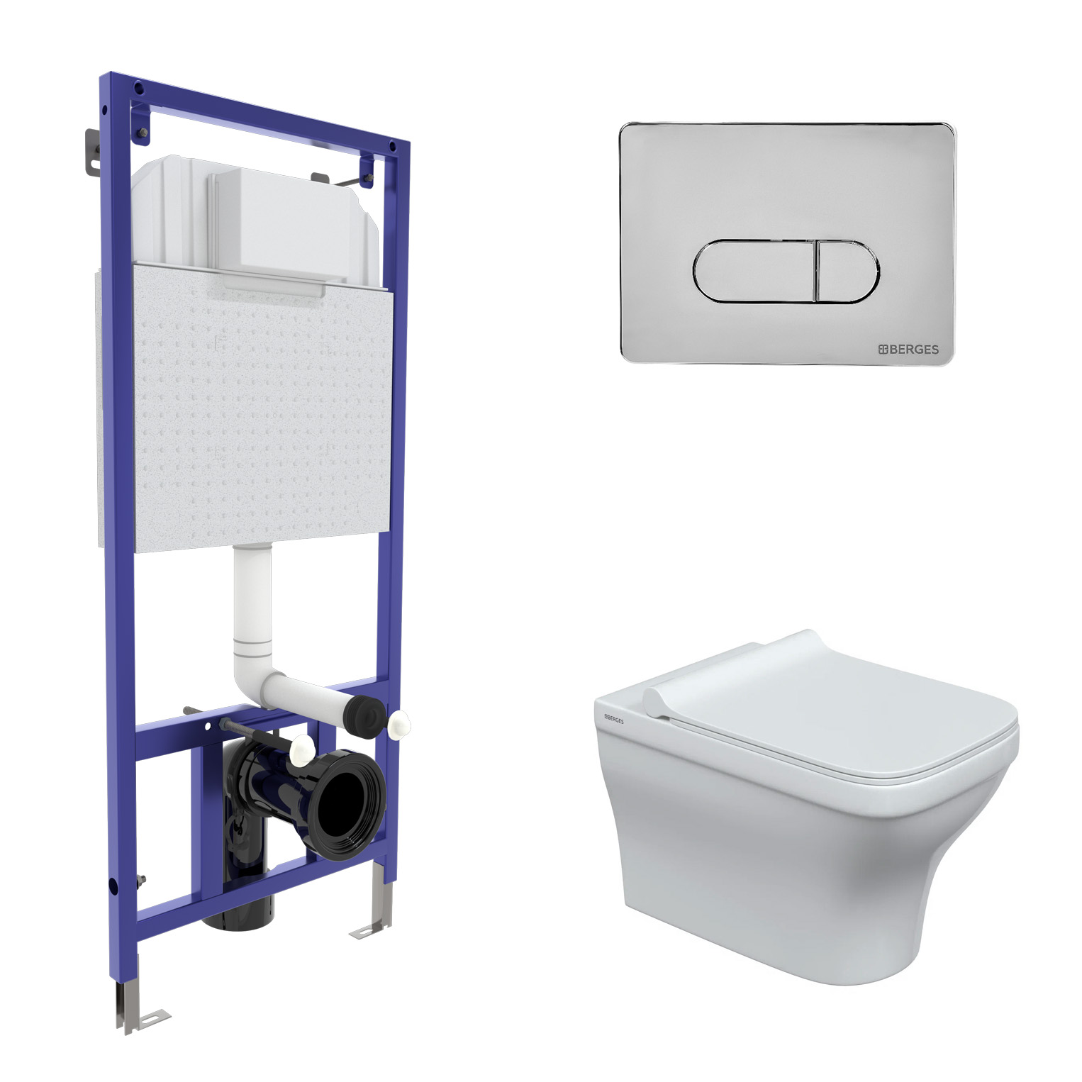 Комплект Berges Wasserhaus 042450 инсталляция Novum + унитаз Strati Rimless + кнопка D3 хром глянец, Белый, 042450