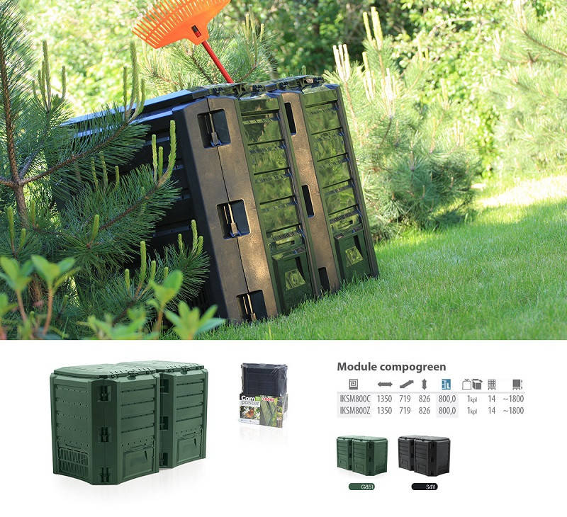 Сегментный компостер (Модуль Compogreen IKSM800) состоит из 2 модулей общей емкостью 800л. Он сочетает в себе все преимущества традиционного компостера Compogreen с повышенной эффективностью.