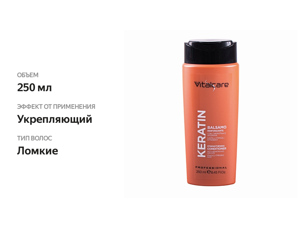 Кондиционер Vitalcare укрепляющий с кератином и аргинином для хрупких, подверженных стрессу волос 250 мл, Италия