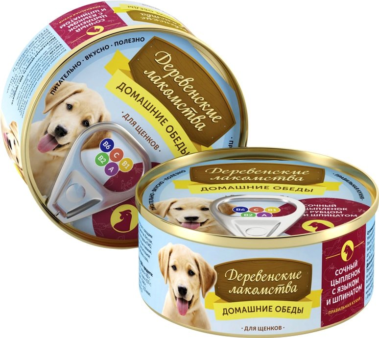 Консервированный корм для собак Деревенские лакомства Сочный цыпленок с языком и шпинатом 100 г