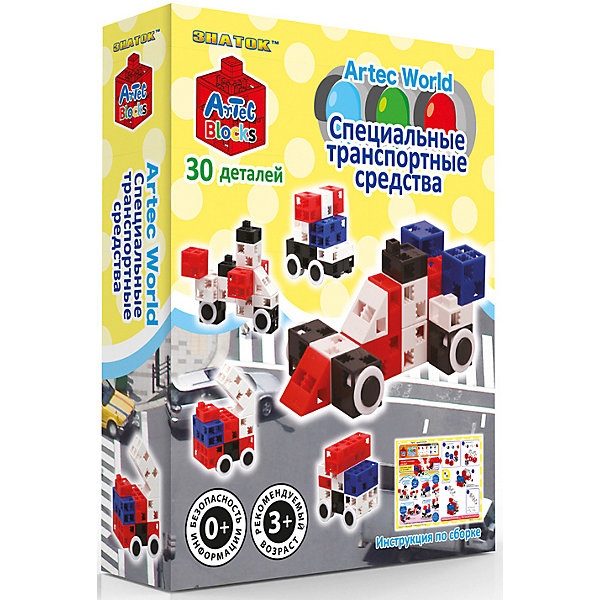 Конструктор Znatok «Специальные транспортные средства» входит в серию Artec World и представляет собой красочные блоки разных форм (треугольники, квадраты, диски). Из них можно собрать несколько фигурок по рекомендациям из набора или неограниченное количество собственных предметов и сооружений.