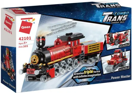 Из конструктора 3 в 1 от бренда QMAN из серии "Trans-combo" ребенок может поочередно собрать собственными руками не только яркий красно-черный паровоз с прицепленным вагоном, но и трактор-каток или мотоцикл, который приехал на станцию техобслуживания. Простое и надежное соединение деталей разных размеров и форм между собой обеспечат специальные крепления. Во время игры ребенок сможет задействовать свою фантазию и придумать интересные сценарии. В процессе сборки и игры с готовой моделью юный конструктор будет развивать мелкую моторику рук, пространственное мышление, внимательность и усидчивость.
