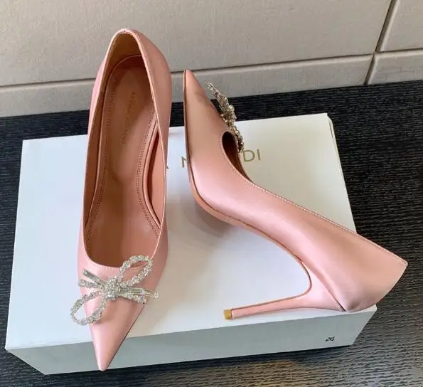 Rosie crystal-encrusted bows lustrous smooth leather satin pumps MUADDI design high heels ladies brand pointed toe pumps AMINA
