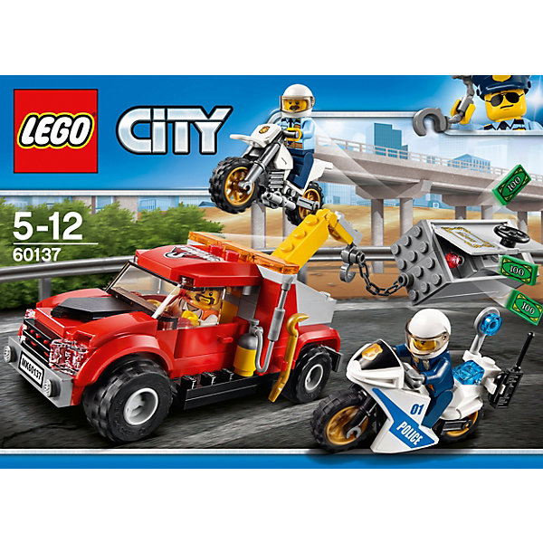 Стражи закона Лего Сити всегда готовы прийти на помощь жителям города. На этот раз грабитель похитил сейф с помощью дорожного эвакуатора Лего Сити. Двое полицейских всегда на страже порядка и вооружившись наручниками они мчатся за грабителем. Полицейские мотоциклы имеют два разных дизайна, один скоростной, предназначенный для погони, а второй патрульный с рацией и синей сигнальной лампой. Все детали на колесиках двигаются и подходят к другим наборам Лего. Буксировщик отлично выполнен и содержит в своем составе много маленьких и уникальных деталей. Минифигурки отлично детализированы и качественно прорисованы. Шлемы полицейских снимаются, а прозрачное стекло отодвигается назад. В набор аксессуаров входит ломик, огнетушитель, наручники, денежные детали, рация. Помоги полицейским добиться справедливости.