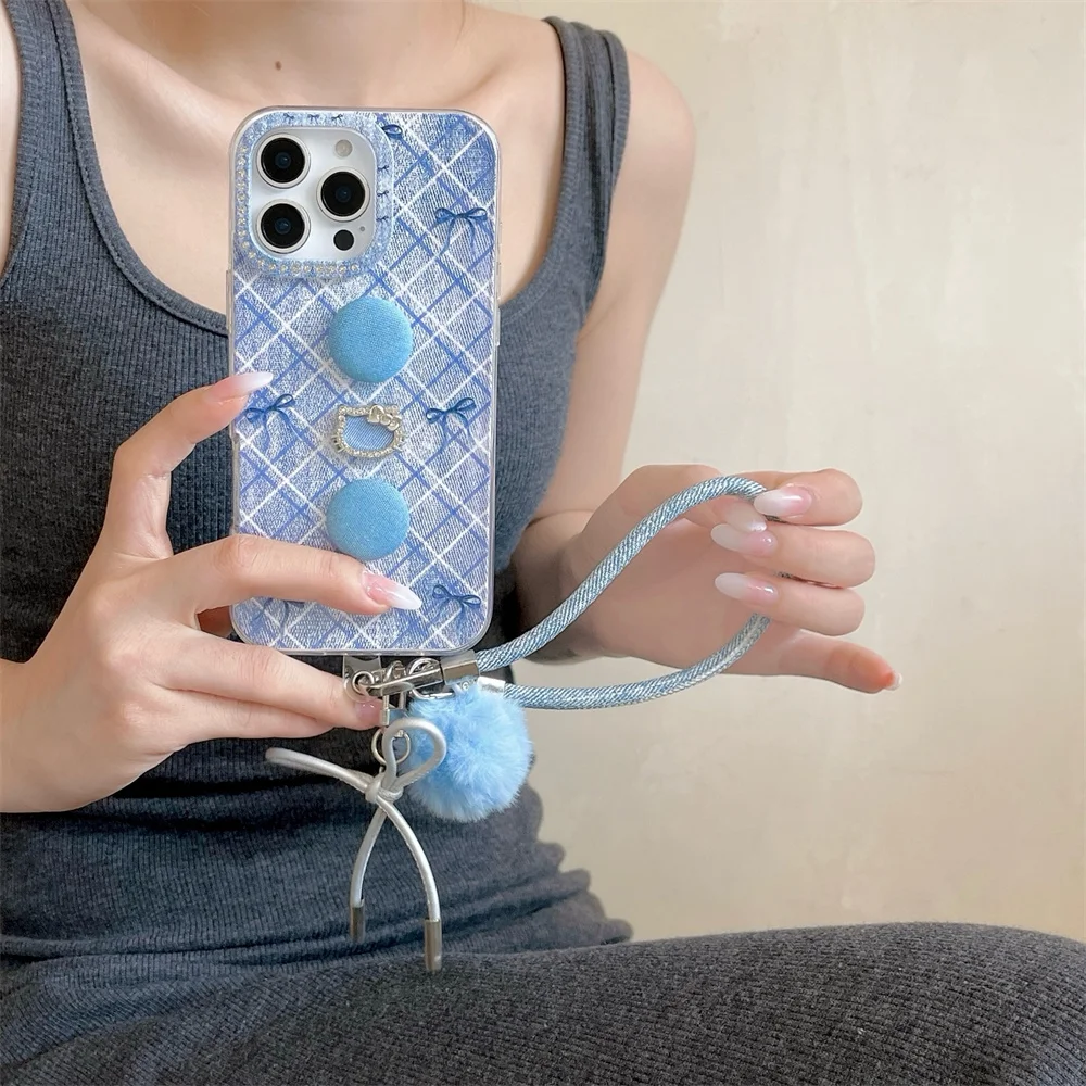Korean INS Fashion Plaid Denim Kitty Cat Phone Case for iPhone 13 14 15 16 Pro Max Cover with Chain Kawaii Hard Protective Cove