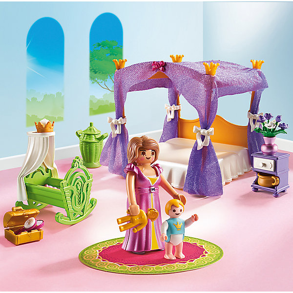 Игровой набор «Замок Принцессы: Покои принцессы с колыбелью» Playmobil включает в себя фигурки мамы-королевы и ее дочки маленькой принцессы. В наборе также представлены предметы мебели для комнаты: кровать мамы и маленькая колыбель для девочки. У фигурок имеются подвижные детали.