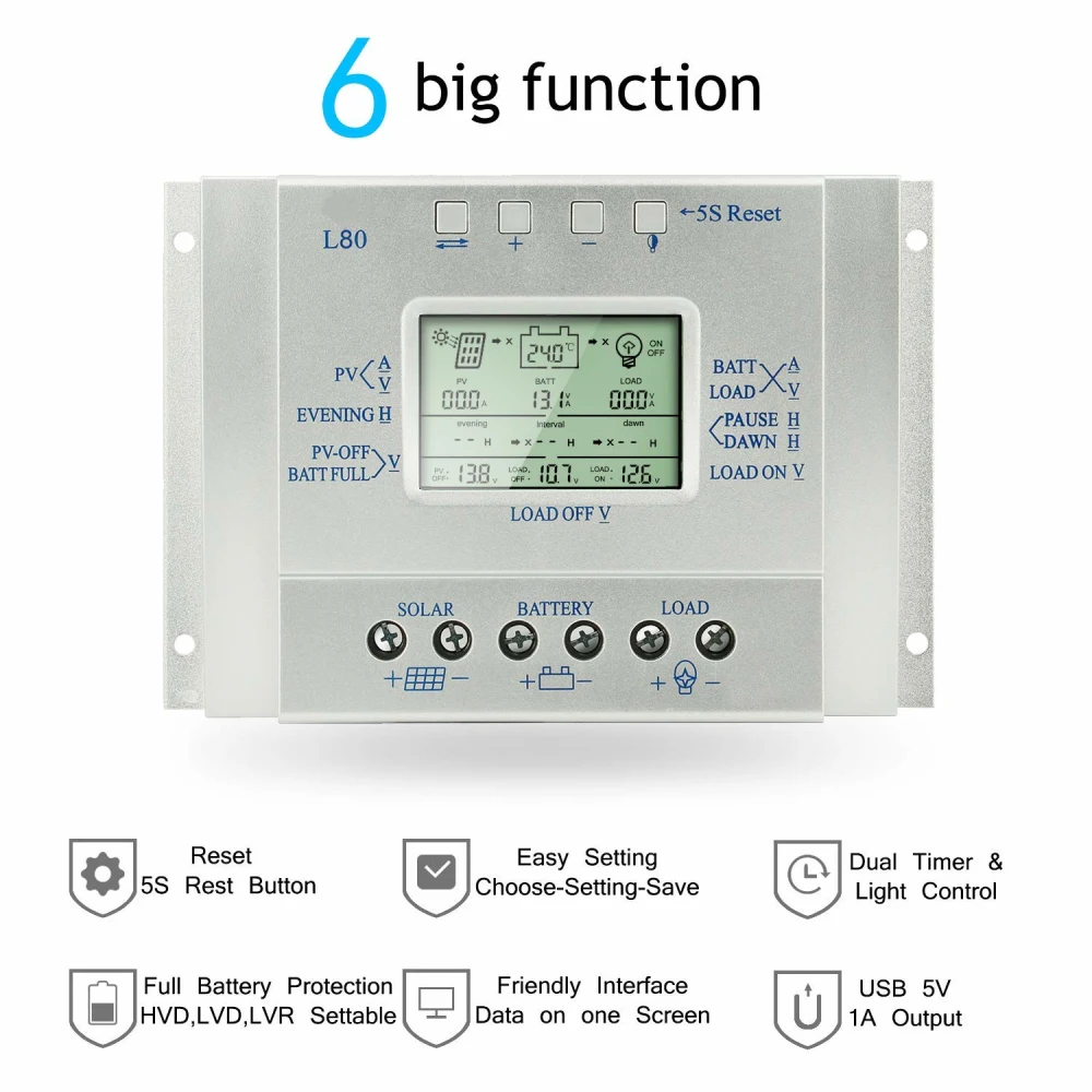Контроллер заряда 12 В/24 В 1000 Вт/2000 Вт автоматическая функция компенсации температуры Режим зарядки ШИМ простой интерфейс работы